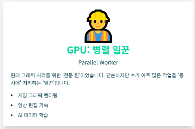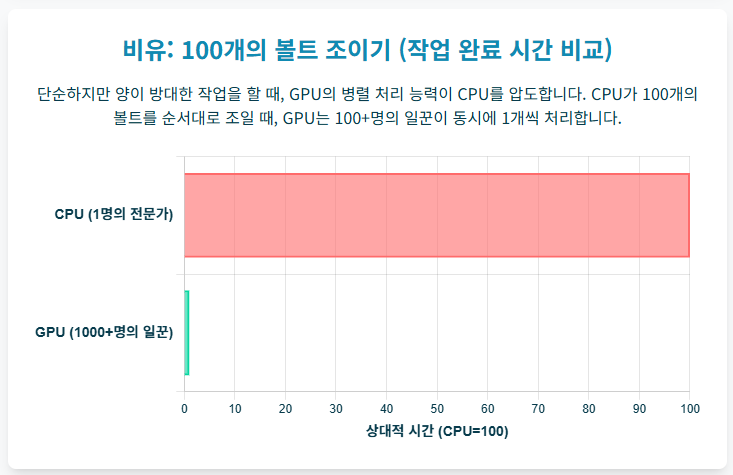 [비유] GPU는 **100개의 똑같은 볼트 조이기**를 합니다. 일꾼 100명이 동시에 1개씩 처리하여 **순식간에** 끝냅니다. 작업은 단순해도 양이 방대할 때는 GPU의 **'병렬(동시) 처리'** 능력이 빛을 발합니다.