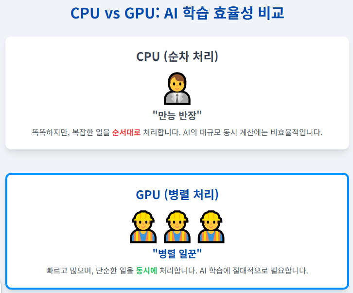 따라서 AI에게는 똑똑하지만 느린 **만능 반장(CPU)**보다, 빠르고 많은 **병렬 일꾼(GPU)**이 절대적으로 필요합니다. 이것이 바로 GPU가 AI 시대의 핵심이 되었고, 한국이 **GPU 26만장** 확보에 국가 역량을 집중하는 이유입니다.