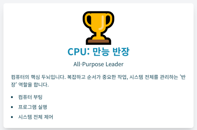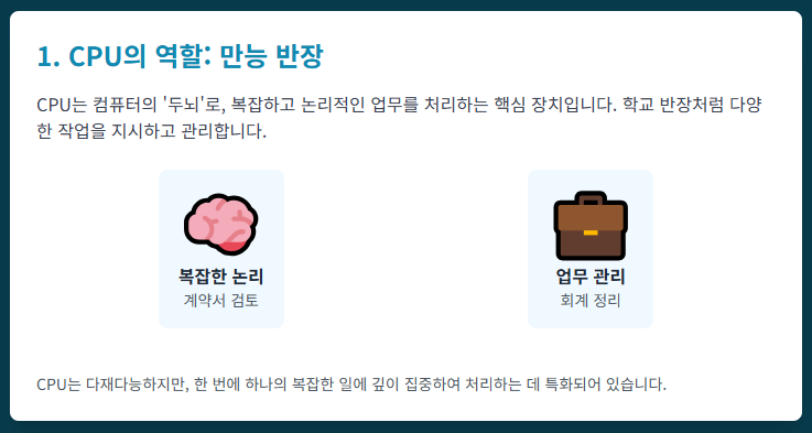 CPU (중앙처리장치)는 '학교 반장'처럼 똑똑하고 다재다능합니다. 회사 회계 정리, 어려운 계약서 검토 등 복잡하고 논리적인 일을 처리하는 데 최적화되어 있습니다.