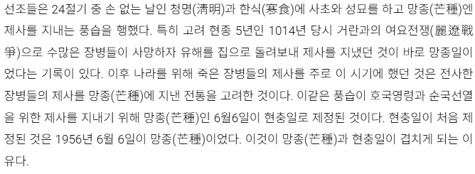 우리나라의 현충일은 매년 6월 6일로 지정되어 있습니다. 이 날짜가 바로 전통 절기인 망종과 겹치는 경우가 많다는 점은 우연이 아닐 수 있습니다. 현충일이 6월 6일이 된 데에는 여러 역사적 배경이 작용했지만, 그중 하나로 망종에 행해지던 전통적인 제사 풍습이 거론됩니다.