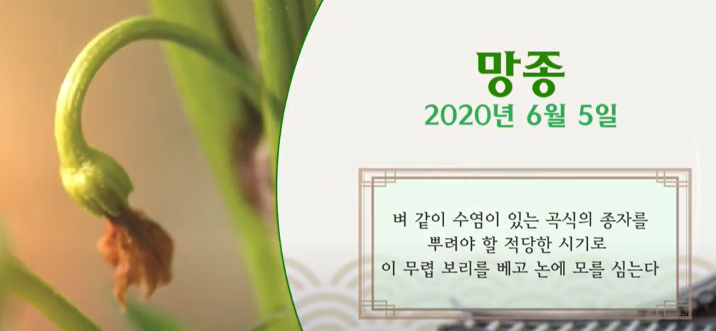 망종(芒種)은 24 절기 중 아홉 번째로, 소만(小滿)과 하지(夏至) 사이에 드는 절기입니다. 보통 양력 6월 5일이나 6일경에 찾아오죠. 망종은 글자 그대로 '까끄라기(芒)'가 있는 곡식의 '씨앗(種)'을 뿌리기에 좋은 때를 의미합니다. 벼, 보리 등 이삭에 수염이 달린 곡식의 종자를 뿌리는 시기라는 뜻이죠.