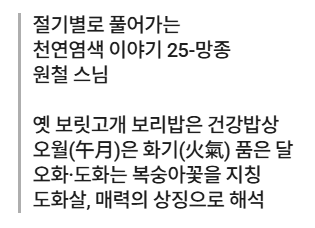 불교에서도 자연의 순환을 중시하며 24 절기를 삶의 이치와 연결하여 해석합니다. 망종 시기에 보리가 익고 벼를 심는 자연의 변화는 생성-성장-결실-소멸로 이어지는 삶의 순환 과정을 보여준다고 봅니다. 불교에서는 이를 통해 영원하지 않은 세상 만물의 진리인 제행무상(諸行無常)의 가르침을 되새길 수 있습니다.