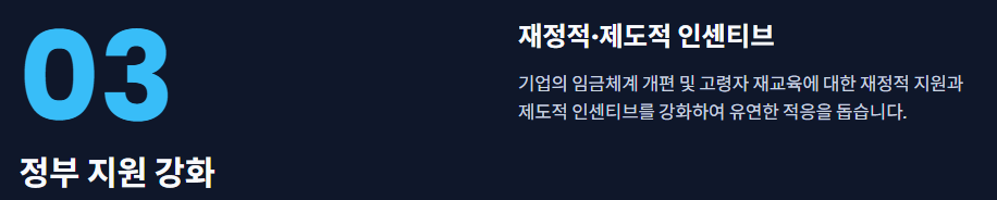 정부는 기업의 임금체계 개편 및 고령자 재교육에 대한 재정적 지원과 제도적 인센티브를 강화하여 기업과 근로자가 변화에 유연하게 적응하도록 도와야 합니다.