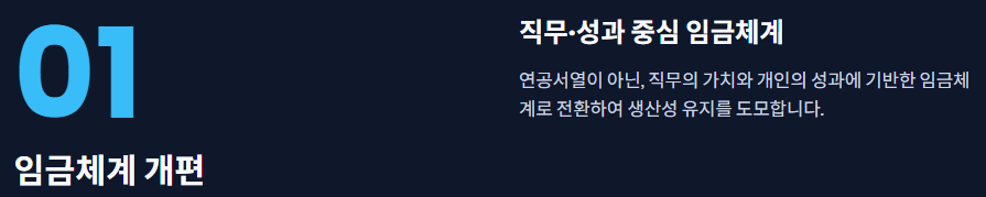 연공서열이 아닌 직무의 가치와 개인의 성과에 기반한 임금체계로 전환하여, 임금피크제의 부작용을 줄이고 고령 인력의 생산성 유지를 도모해야 합니다.
