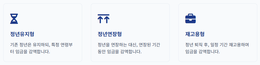 - 정년유지형: 기존 정년은 그대로 유지하되, 특정 연령(예: 55세)부터 임금을 감액.