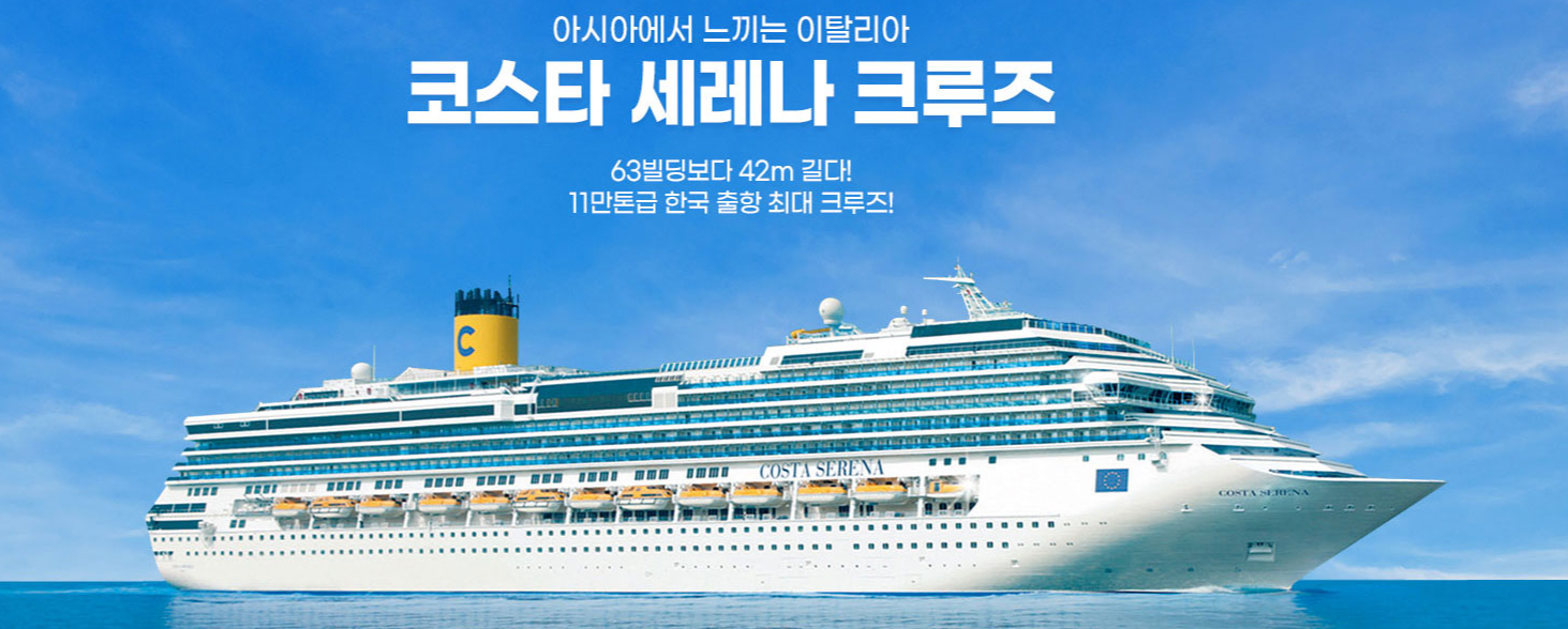**<코스타세레나호>**는 지중해의 신화와 로마 시대를 모티브로 디자인된 럭셔리 크루즈선입니다. 총 1,500개의 선실, 5개의 레스토랑, 13개의 바, 4개의 수영장 등 최고급 시설을 자랑하며, 선내에서 진행되는 다채로운 엔터테인먼트 프로그램과 각 기항지에서의 문화 체험이 어우러져 완벽한 여행을 선사합니다.