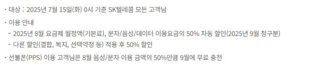 SK텔레콤은 대규모 고객 감사제를 통해 파격적인 혜택을 제공합니다. 가장 주목할 만한 점은 바로 8월 통신 요금 50% 할인인데요. 기존 고객뿐만 아니라 7월 14일까지 신규 가입하는 고객까지 모두 이 혜택을 누릴 수 있습니다.