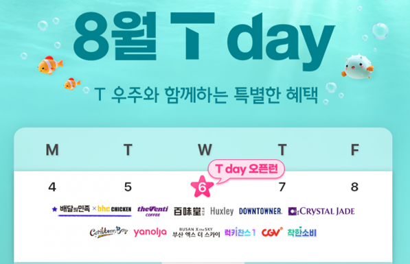 SKT는 매월 T Day와 0 Day를 통해 고객 유형에 맞는 특별한 혜택을 선사합니다. 8월 T Day는 실생활에서 자주 이용하는 브랜드를 중심으로 풍성한 할인 혜택이 마련되어 있습니다.