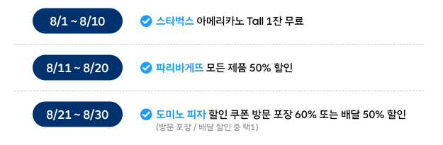 이어 8월 11일부터 20일까지는 파리바게뜨 전 제품을 최대 1만원까지 50% 할인된 가격으로 즐길 수 있으며, 8월 21일부터 30일까지는 도미노피자 배달 50% 또는 포장 60% 할인 혜택이 제공됩니다.