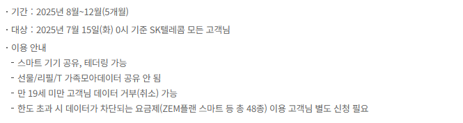 여기에 8월부터 연말까지 5개월간 매월 데이터 50GB를 추가 제공하여, 데이터 사용량이 많은 분들에게 큰 도움이 될 것으로 기대됩니다. 요금 부담을 줄이면서 넉넉하게 데이터를 사용할 수 있는 절호의 기회이니 꼭 챙기세요!