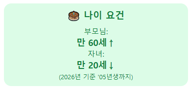 - 직계존속(부모님/조부모님): 만 60세 이상