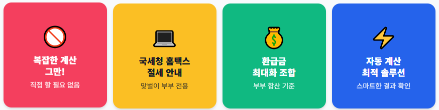 머리 아프게 직접 계산할 필요 없습니다. 국세청 홈택스에서는 **'맞벌이 부부 절세 안내'** 서비스를 통해 부부 합산 환급금이 최대가 되는 조합을 자동으로 계산해 줍니다.