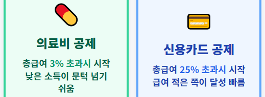 일반 소득공제와 달리 의료비와 신용카드는 소득이 '낮은' 배우자에게 유리한 경우가 많습니다. 그 이유는 **'문턱(기준)'** 때문입니다.