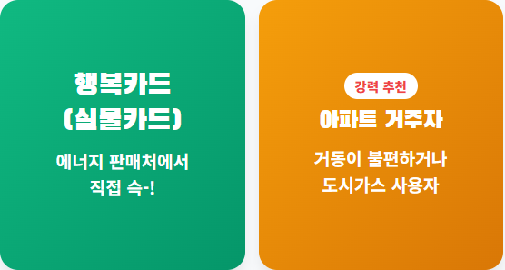 | 추천 대상 | 아파트 거주자, 도시가스 사용자 | 주택 거주자, 등유/연탄 사용자 |