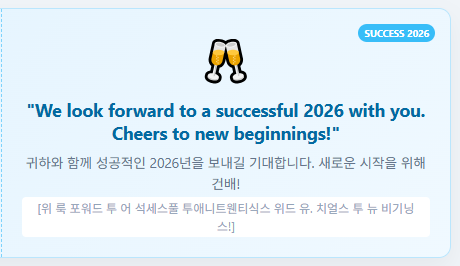(해석: 귀하와 함께 성공적인 2026년을 보내길 기대합니다. 새로운 시작을 위해 건배!)