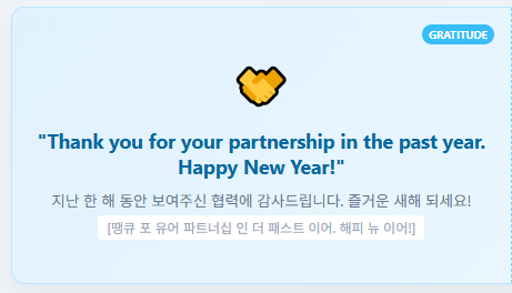 [발음: 땡큐 포 유어 파트너십 인 더 패스트 이어. 해피 뉴 이어!]