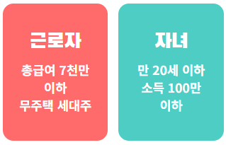 - 자녀 요건: 기본공제 대상자(만 20세 이하, 소득금액 100만 원 이하)여야 함