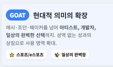 오늘날 GOAT는 리오넬 메시, 마이클 조던, 페이커와 같은 스포츠 및 e스포츠 스타들에게 주로 쓰이지만, 그 사용 영역은 나날이 넓어지고 있습니다. 뛰어난 성과를 낸 아티스트나 개발자, 심지어 일상 속에서 완벽한 선택을 했을 때도 사용되곤 합니다.