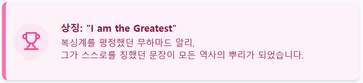 스스로를 "I am the greatest"라고 칭하며 복싱계를 평정했던 알리는 이 단어의 살아있는 상징이었습니다.
