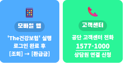 - 2 모바일 앱: 'The건강보험' 앱 실행 → 로그인 → [조회] → [환급금 조회].