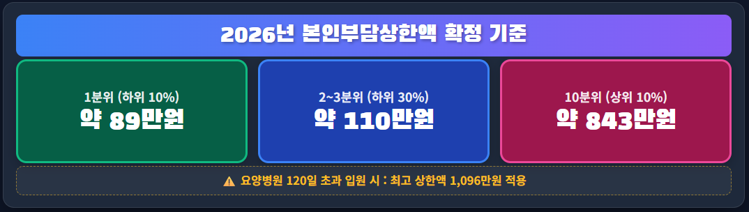 * 요양병원 120일 초과 입원 시 최고 상한액은 1,096만원이 적용됩니다.