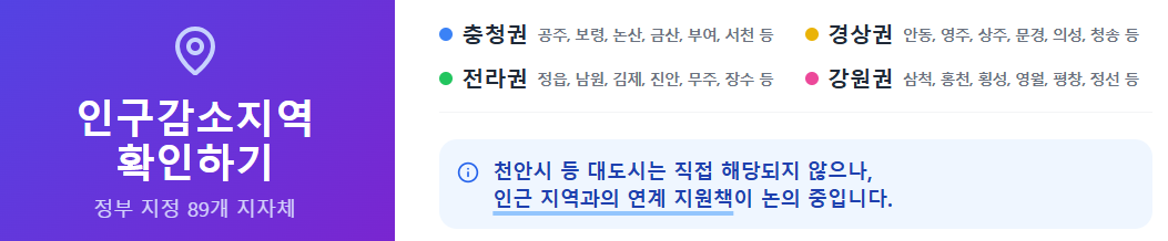 * 충남 천안시와 같은 대도시는 직접적인 인구감소지역에는 해당하지 않으나, 인근 지역과의 연계 지원책이 논의되고 있습니다.