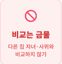 - 비교는 금물: 다른 집 자녀나 며느리·사위와 비교하는 말은 절대 삼가주세요.