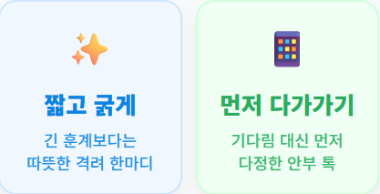 - 짧고 굵게: 너무 긴 훈계보다는 짧은 격려와 칭찬이 훨씬 효과적입니다.