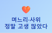 사랑하는 며느리와 사위에게 "고생 많았다", "네가 있어 든든하다"는 진심 어린 메시지를 보내보세요. 고부 갈등, 장서 갈등을 녹이는 가장 큰 열쇠는 부모님의 따뜻한 한마디입니다.