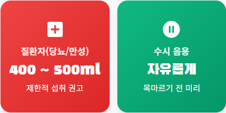 | 하루 권장량 | 1.5L ~ 2L 이내 | 400ml ~ 500ml 이내 |