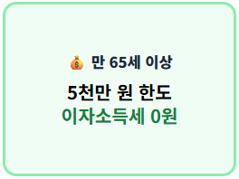- 비과세 저축 활용: 만 65세 이상이라면 5,000만 원 한도 내에서 이자소득세 0원을 실현하세요.