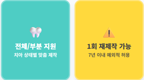 임플란트 식립이 어려운 경우 '틀니' 혜택을 선택할 수 있습니다. 완전 무치악(치아가 전혀 없는 상태)인 경우 전체 틀니를, 일부 치아가 남은 경우 부분 틀니를 지원합니다.