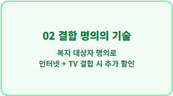 가족 중 한 명이라도 복지 감면 대상자라면, 해당 회선을 중심으로 인터넷과 TV를 묶으세요. 감면 대상자 명의로 결합 상품을 가입할 경우 추가적인 요금 할인이 발생합니다.