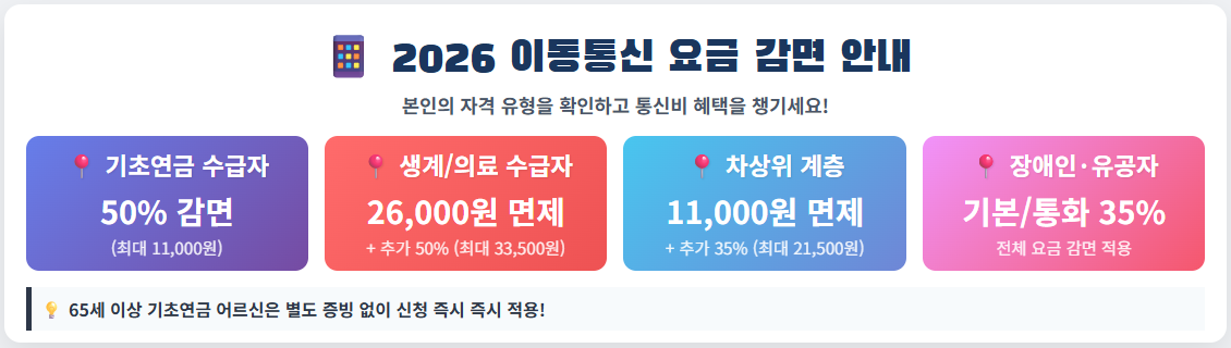 - 📍 기초생활수급자(생계/의료): 월 26,000원 기본 면제 + 추가 50% 할인 (최대 33,500원)