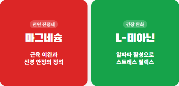 ② L-테아닌 (L-Theanine): 녹차에 들어있는 성분으로, 뇌에서 알파파 발생을 도와 긴장을 완화해 줍니다. 업무 스트레스가 심할 때 큰 도움이 됩니다.