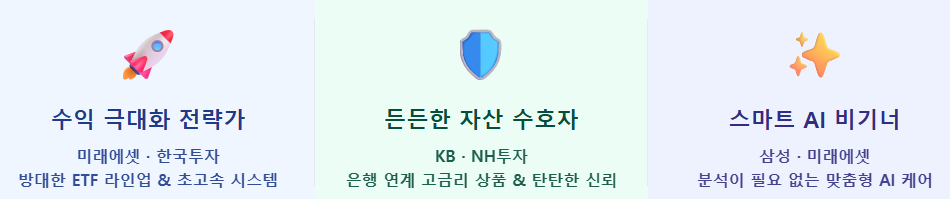 - 초보 투자형(AI 일임): 로보어드바이저 서비스가 잘 갖춰진 삼성증권이나 미래에셋을 추천합니다.