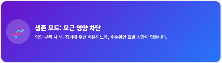 핵심 기전: 우리 몸은 영양 공급이 급격히 줄어들면 심장이나 뇌 같은 생존에 필수적인 장기에 영양소를 우선 배분합니다. 상대적으로 순위가 밀리는 모근은 영양 공급이 끊기며 휴지기로 전환되고, 주사를 맞은 지 약 2~4개월 뒤부터 머리카락이 빠지기 시작합니다.