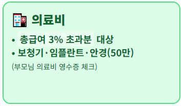 의료비는 총급여의 3%를 초과하는 금액부터 공제됩니다. 4060 세대는 부모님의 보청기, 치과 임플란트, 안경 구입비 등이 누락되지 않았는지 꼼꼼히 영수증을 챙겨야 합니다. (안경·콘택트렌즈는 1인당 50만 원 한도)