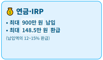 노후 준비를 하는 5060 세대에게 가장 강력한 무기입니다. 연금저축과 IRP를 합쳐 최대 900만 원까지 납입액의 12%~15%를 돌려받을 수 있습니다. 환급액만 최대 148.5만 원에 달합니다.