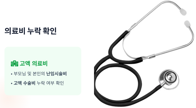| 의료비 | 부모님 및 본인의 난임시술비, 고액 수술비 누락 확인 |
